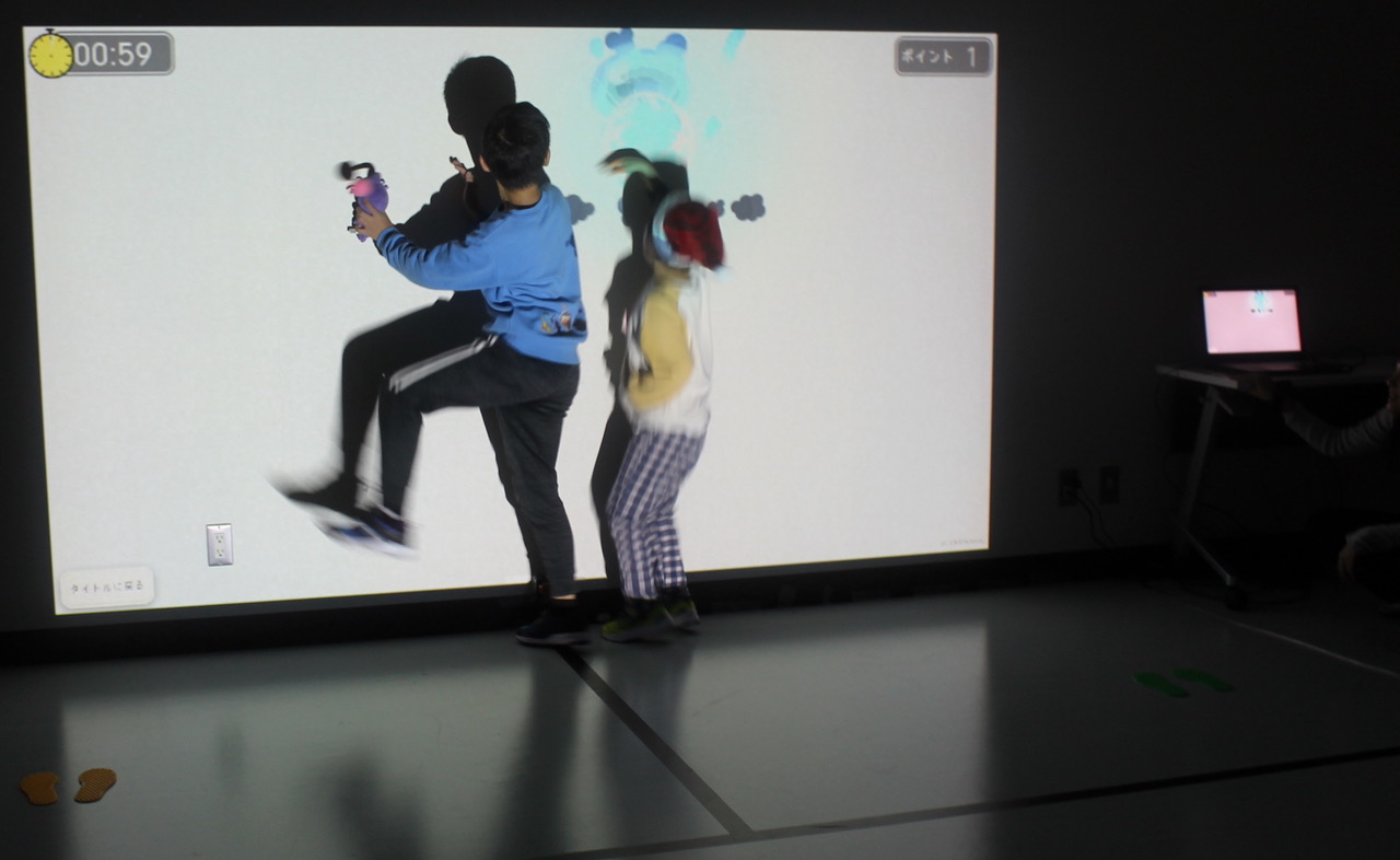 デジリハでは、タッチセンサー(HOKUYO)を使った「忍者でドロン」では、出現した忍者をタッチしてやっつけるゲームを競い合いながら楽しんだり、2人で協力して行いコミュニケーションを図りました。また、加速度センサー(Moff)を使った「きらきらジュエリー」では、揺れないように輪を渡していく設定で手や足での受け渡しを行いました。