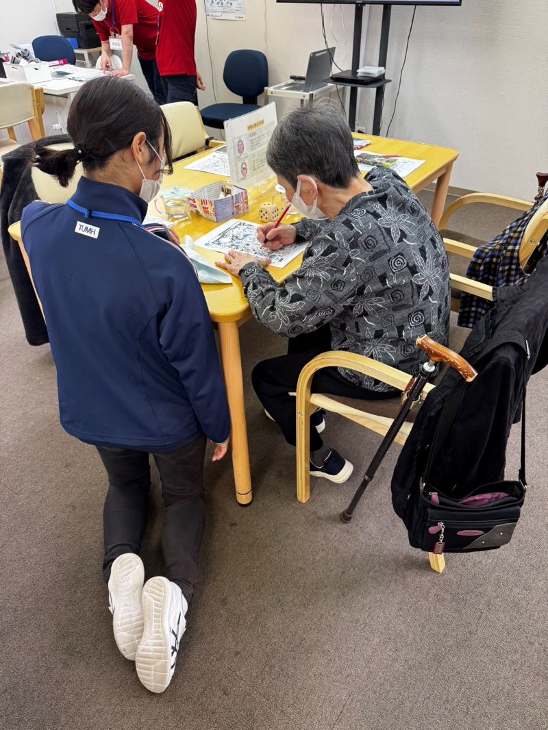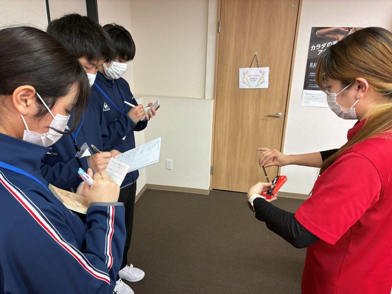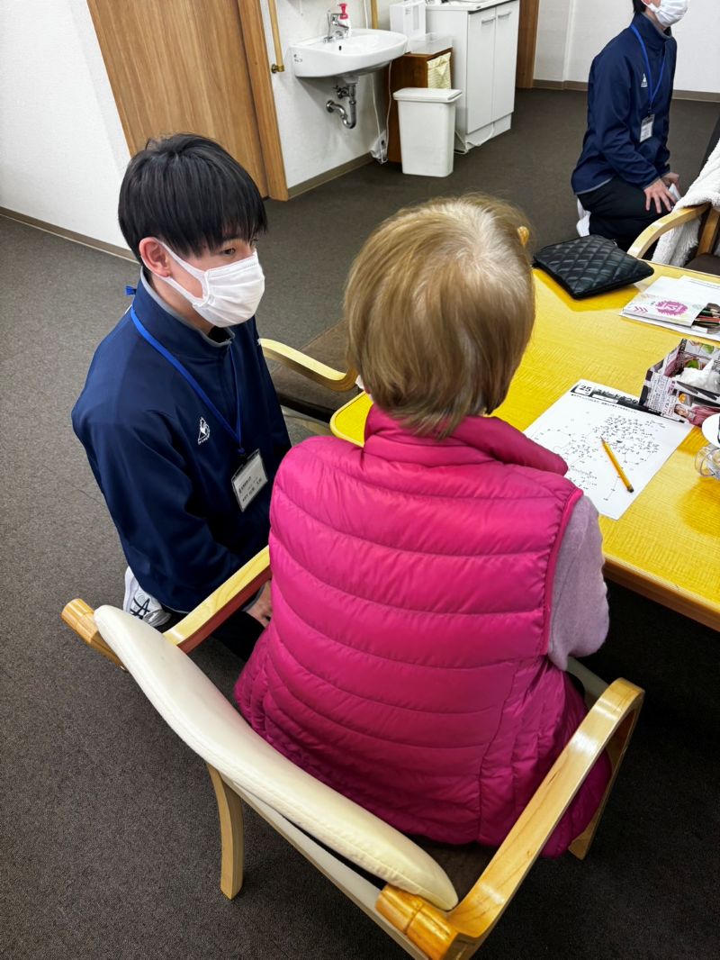 今回実習でお世話になっている2年生3名は、緊張しながらも、指導してくださった本学卒業生の太田先生(赤いポロシャツ)や坂根先生(ネイビーのスクラブ)の言葉をしっかりとメモに取りながら、真剣に耳を傾けていました。また、利用者様とのコミュニケーションもまだ慣れない様子でしたが、その一生懸命な姿勢はしっかりと伝わってきました!