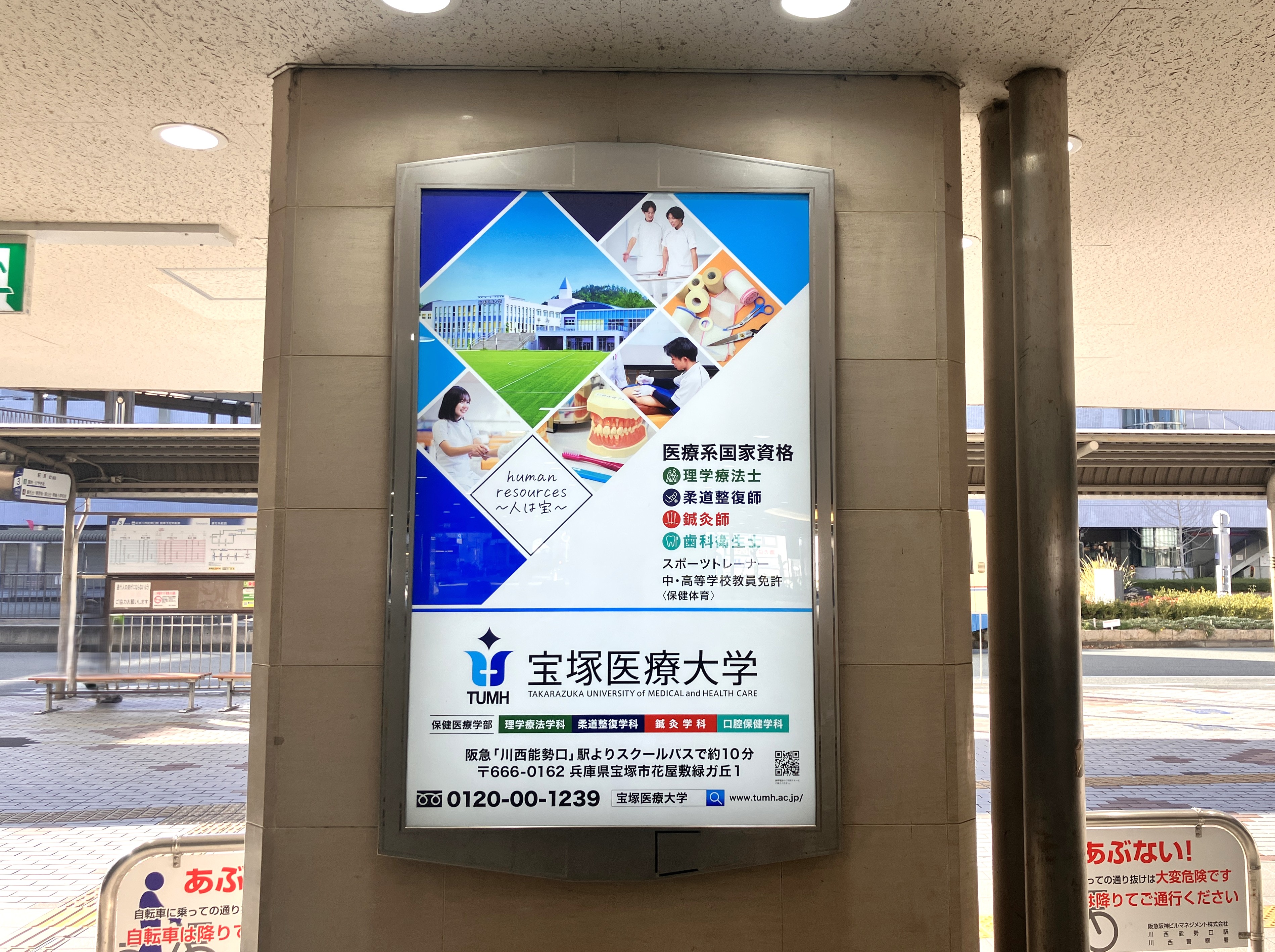 保健医療学部宝塚キャンパスの最寄り駅である川西能勢口駅に設置されている看板のデザインが変更されました!