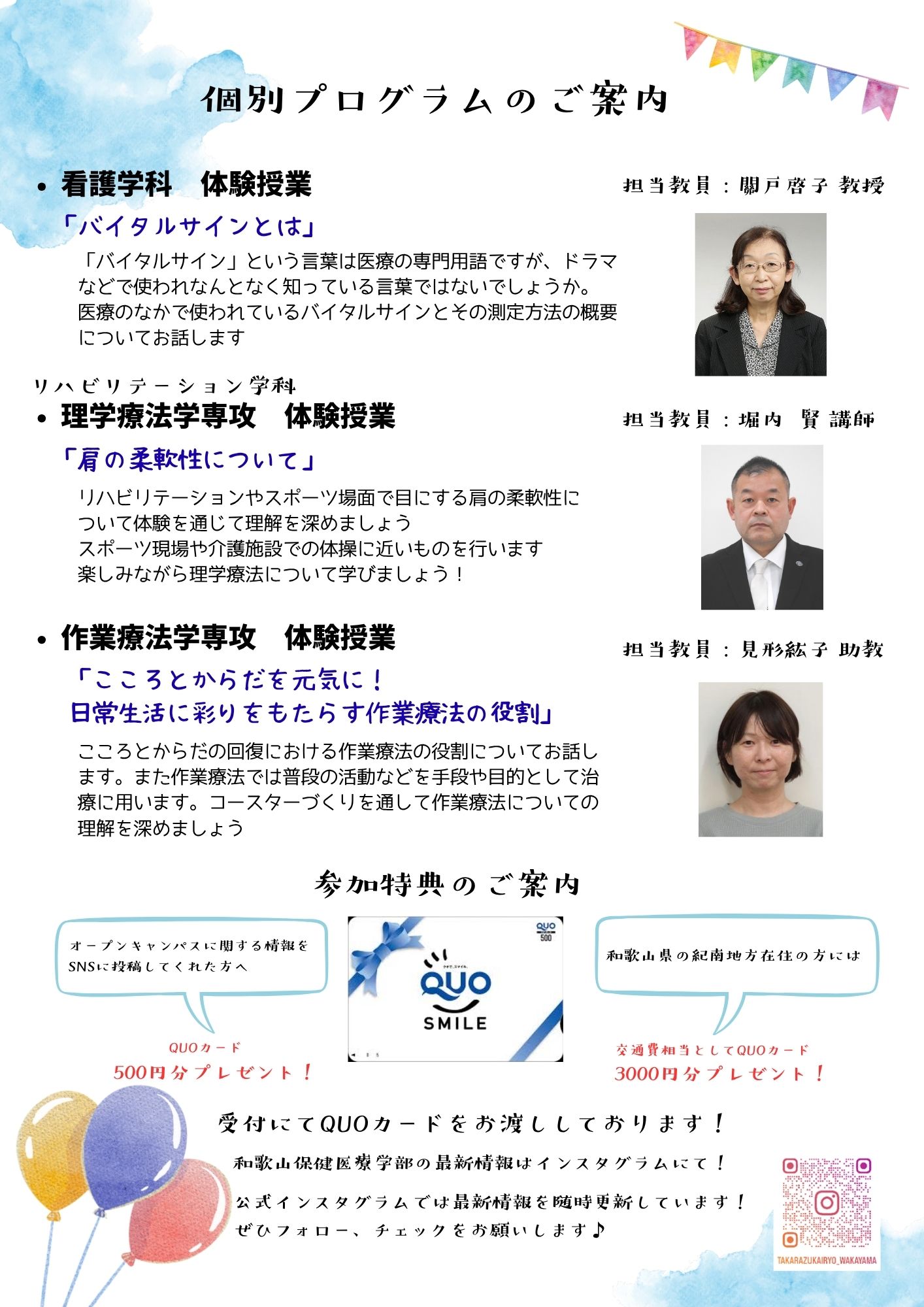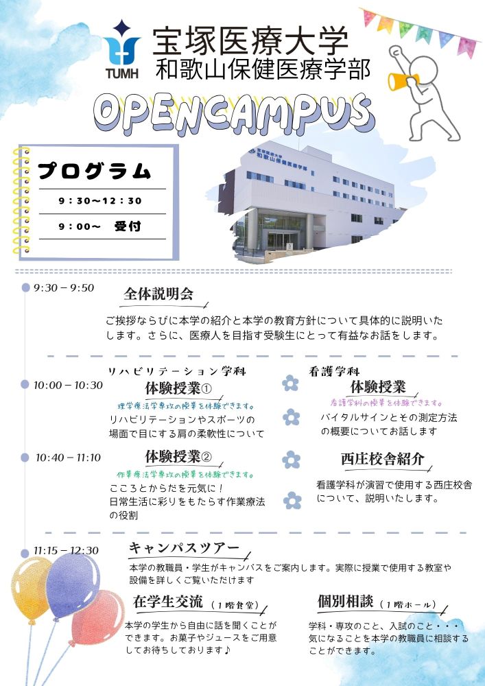 2026.04.07 和歌山保健医療学部 #オープンキャンパス 【4月19日(日)開催】2026年度 第1回オープンキャンパスを開催します! 4月19日(日)オープンキャンパスを開催します! 9時00分から受付、9時30分から全体説明会が始まります! 10時からは各学科・専攻の体験授業が行われます。 体験授業のあとはキャンパスツアーや在学生交流、また個別相談など盛りだくさんの内容です。 ご参加お待ちしています! 次回は6月14日(日)です。 お申し込みはこちら