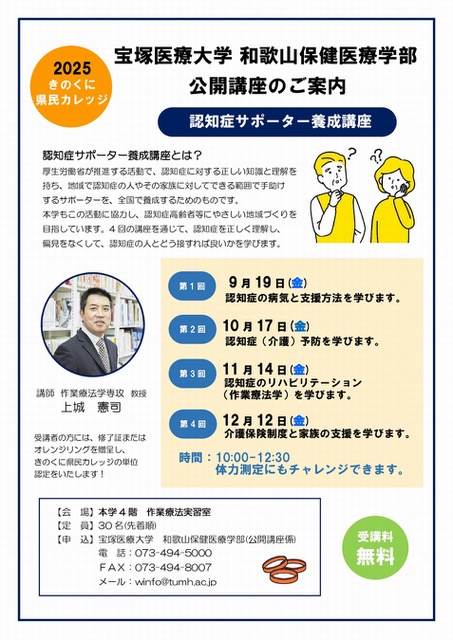 次回は10月17日(金)、本学4階での開催となります。本学の「認知症サポーター養成講座」は、高校生の皆様もご参加いただけますので、ご連絡(073-494-5000)をお待ちしております。