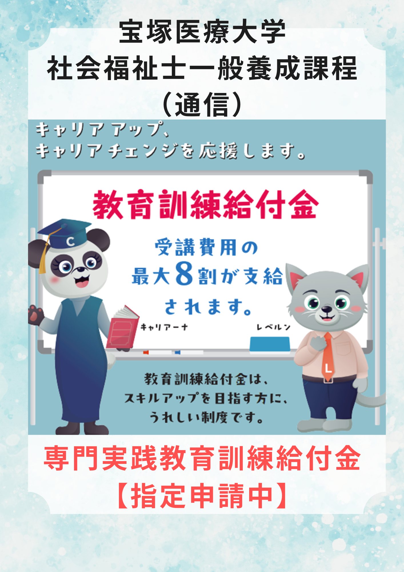 2025.10.23 その他 #その他 社会福祉士養成課程『専門実践教育訓練給付金』指定申請中! 宝塚医療大学・社会福祉士養成課程(通信)では、現在専門実践教育訓練給付金の指定申請を行っています。 詳細が決定次第、HPやSNSに掲載予定です😀
