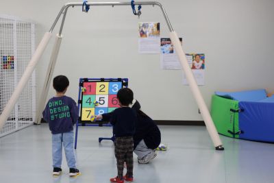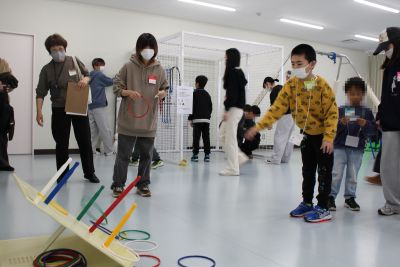 ミニ運動会では、的あて・ボーリング・輪投げを行い各ブースでシールをもらって喜んで台紙に貼り付けていました。