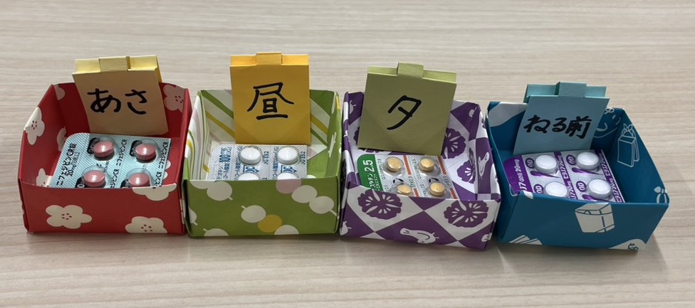 創作活動は、折り紙で「くすり箱」を創作しました。画用紙やマグネットを使っていつ飲む薬なのか?を視覚的に分かりやすく準備しておくことが出来ます。創