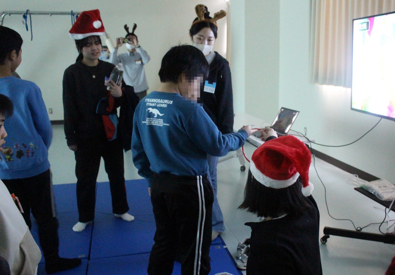 当日は近隣の小学校に通う児童が7名参加してくれました。 今回は3つのプログラムを行いました。デジリハ(デジタルアートと各種センサーを活用したリハビリテーションツール)を活用した運動プログラムと創作活動(お菓子ツリー)、調理活動(カップケーキ)を実施しました。