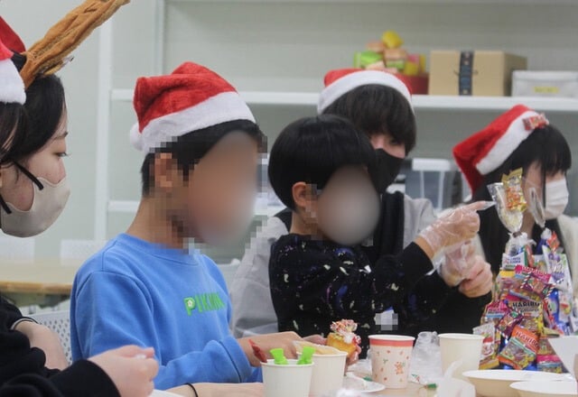 カップケーキ作りでは、ホイップクリームやチョコペン、チョコスプレーなどを使って個性豊かなカップケーキを楽しみながら作成していました。一緒に参加していた親御さんや学生に作ってプレゼントしてくれる優しいお子さんも多くおられました。
